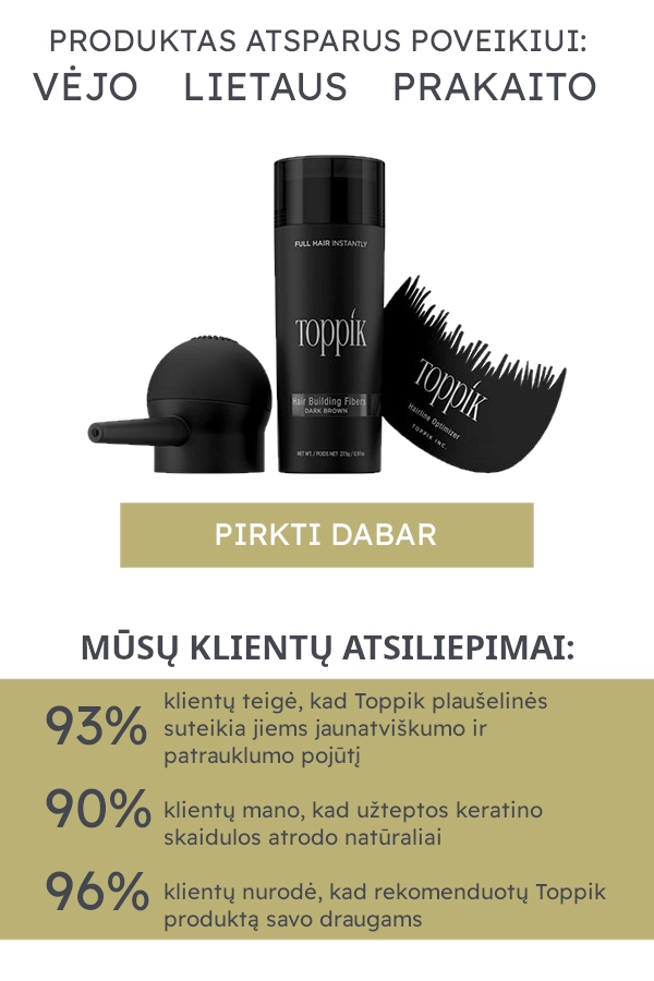Toppik plaukams yra revoliucinis produktas, pagrįstas keratino mikropluošto technologija. Toppik sudėtyje esantys plaukų keratino pluoštai yra pagaminti iš natūralaus keratino, todėl puikiai susilieja su esamais plaukais, sukurdami akimirksniu storinantį ir storinantį efektą. Mikropluoštai plaukams ypač efektyviai maskuoja retėjančias vietas, o natūrali jų išvaizda užtikrina, kad niekas nepastebėtų skirtumo tarp pluoštų ir jūsų plaukų.